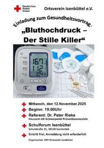 Der DRK Ortsverein lädt zu einem Gesundheitsvortrag ein. Thema Bluthochdruck – Der Stille Killer